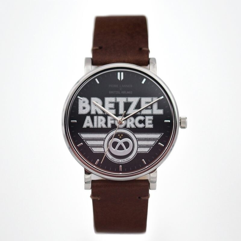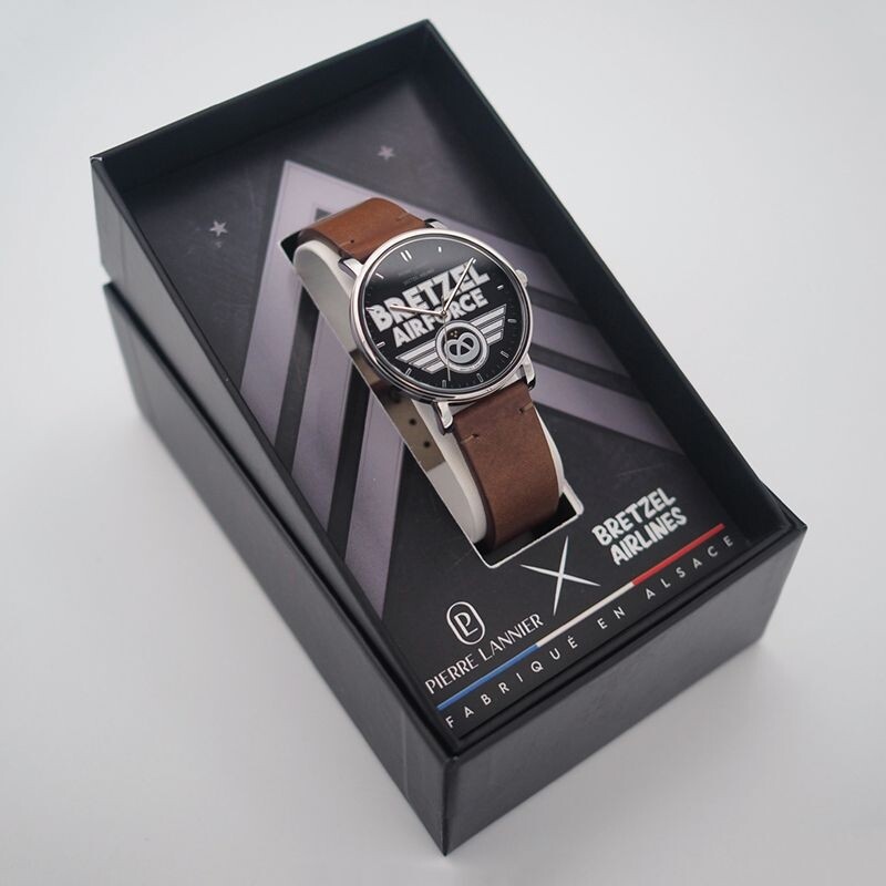 Montre en série Spéciale BRETZEL AIRLINES PIERRE LANNIER. Montre Acier - Bretzel Air Force - Bracelet Cuir Bride Acajou.Si tu te prends pour Maverick dans Top Gun, et que tu aimes prendre l'apéro,tu peux rejoindre la Bretzel Air Force !